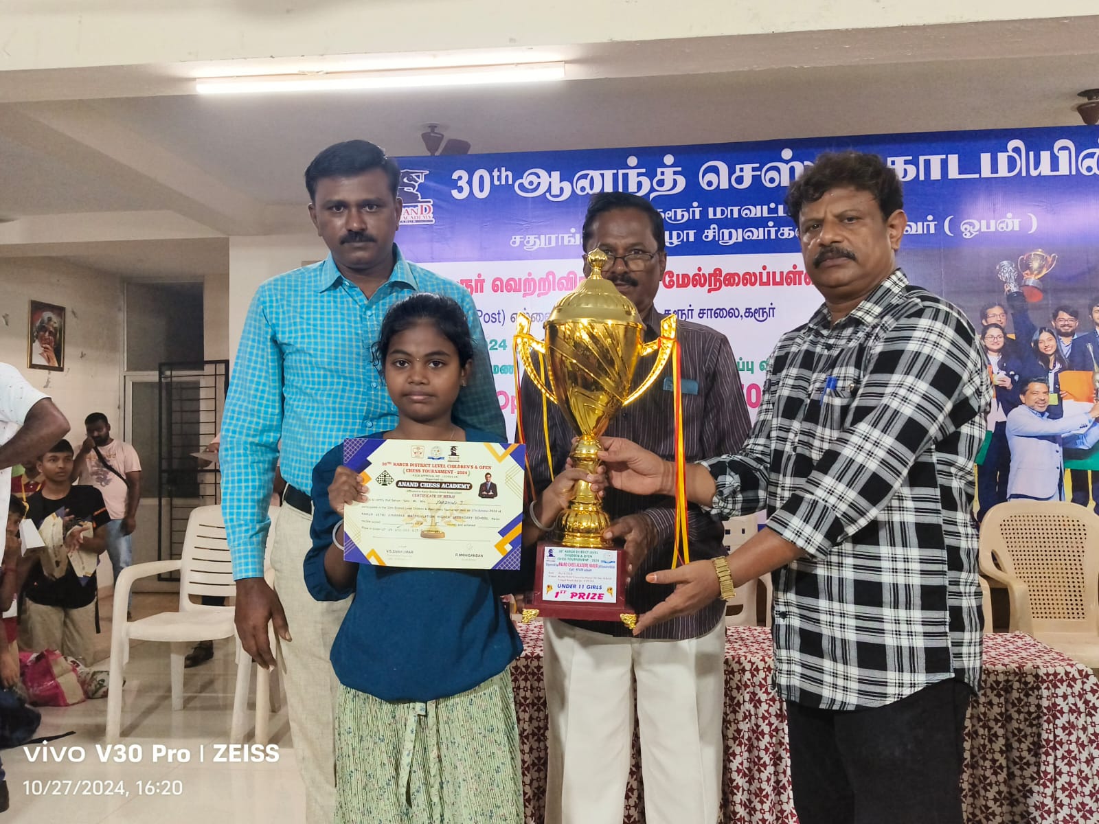 This is Indu S from Thennilai. I have been playing chess for the past 2 years. With the unwavering support of the Karur District Chess Association (KDCA) and the dedicated guidance of my coach, Mr. Naveen, I have made significant progress in the game and achieved success. I am sincerely grateful for their constant encouragement and motivation throughout my chess journey.